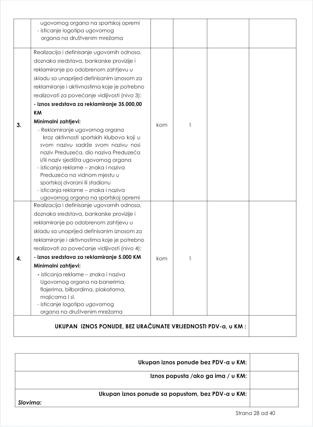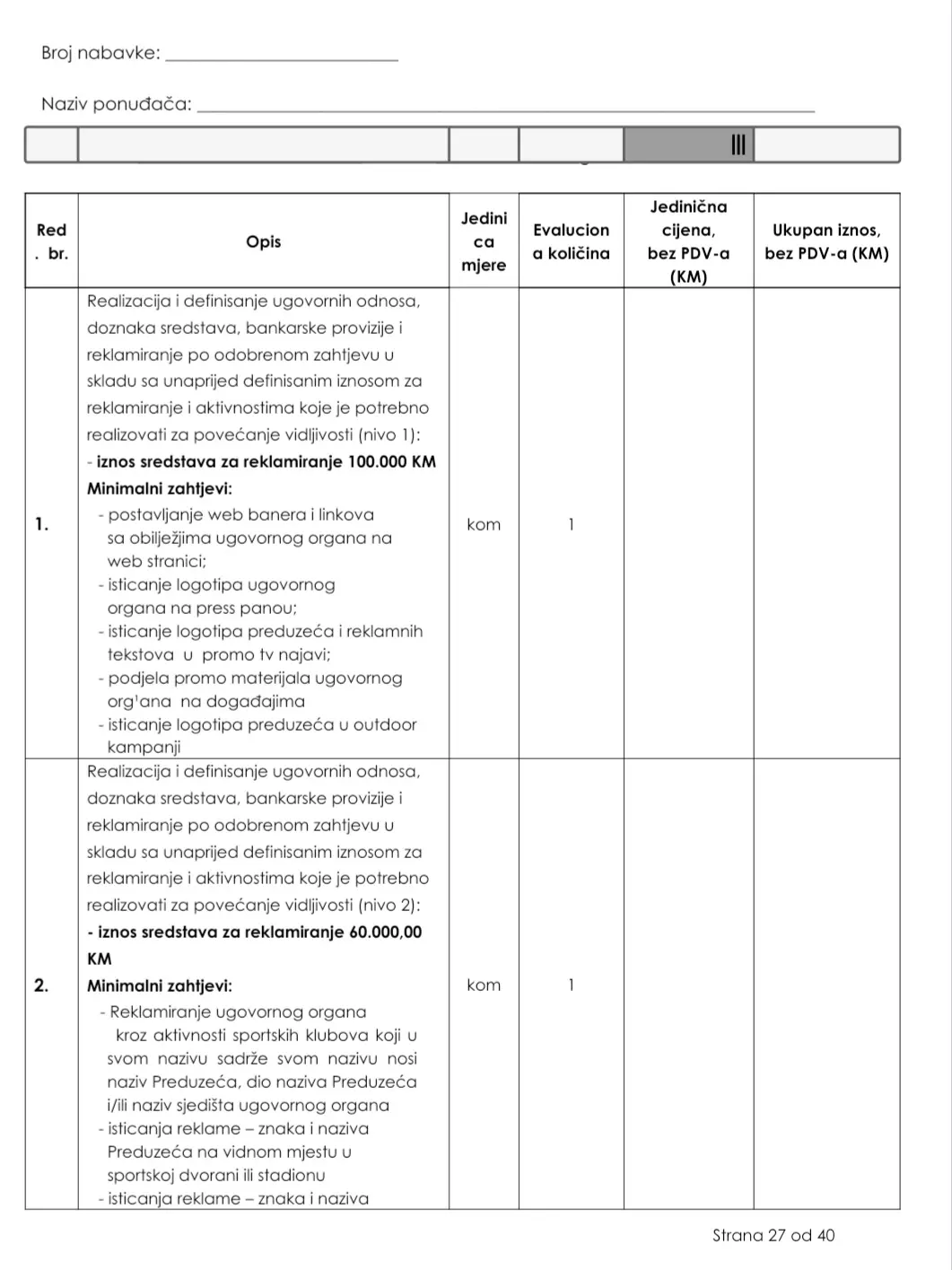 Postavljanje web banera i linkova sa obilježjima ugovornog organa na web stranici, isticanje logotipa na press panou, reklamni tekstovi u promo TV najavi, podjela promo materijala u outdoor kampanji procijenjeni su na 100.000 KM.