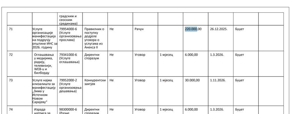 Kroz direktne sporazume i po 6.000 KM je planirano za izdvajanje i za oglašavanje u medijima, izradu promotivnog filma, napitke za espreso aparat u kafe kuhinji, sredstva za održavanje higijene u kafe kuhinji u mjesnim zajednicama, zatim za paketiće, poklone za vrtiće i prvačiće.